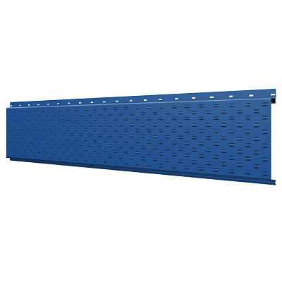 Линеарная потолочно-стеновая панель с ПЕРФОРАЦИЕЙ для вентиляции цвет RAL5005 Синий Сигнал применяется в качестве софитов для подшивы крыши, наружной и внутренней отделки потолков, стен, фронтонов фасада дома в Красноярске.