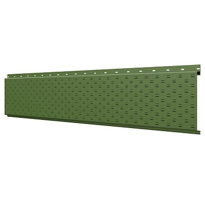 Линеарная потолочно-стеновая панель с ПЕРФОРАЦИЕЙ для вентиляции цвет RAL6002 Зеленый Лист применяется в качестве софитов для подшивы крыши, наружной и внутренней отделки потолков, стен, фронтонов фасада дома в Красноярске.