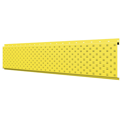 Линеарная потолочно-стеновая панель с ПЕРФОРАЦИЕЙ для вентиляции цвет RAL1018 Желтый применяется в качестве софитов для подшивы крыши, наружной и внутренней отделки потолков, стен, фронтонов фасада дома в Красноярске.