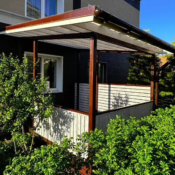Элегантная беседка выполнена из металлопланкена в цвете Светлая Берёза с покрытием SteelArt под дерево, которое точно передаёт текстуру натуральной древесины и обеспечивает долговечность конструкции. Лёгкий древесный оттенок создаёт уютную атмосферу, гармонично вписывается в окружающий ландшафт и придаёт пространству изысканный вид. Это идеальный вариант для комфортного отдыха на участке и стильного оформления зоны досуга.